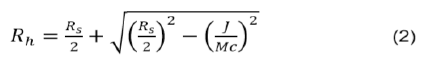 As principais grandezas necessárias para podermos saber mais a respeito de um buraco negro são: massa da estrela origem ou do buraco negro e sua velocidade de rotação. No caso em que o blackhole não possui rotação, utiliza-se a simetria de Schwarzchild, e no caso com velocidade de rotação maior que zero utiliza-se a métrica de Kerr. Em comparação com a equação (1), se for um buraco negro de massa M em rotação, teremos que o raio do seu horizonte de eventos 𝑅ℎserá definido pela equação (2), onde J corresponde ao momento angular da estrela,𝑅𝑠o raio de Schwarzchild e c e G são constantes universais: