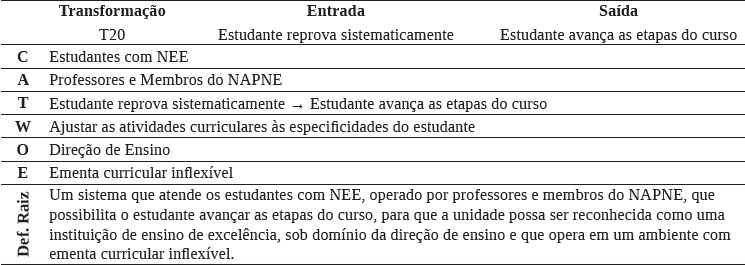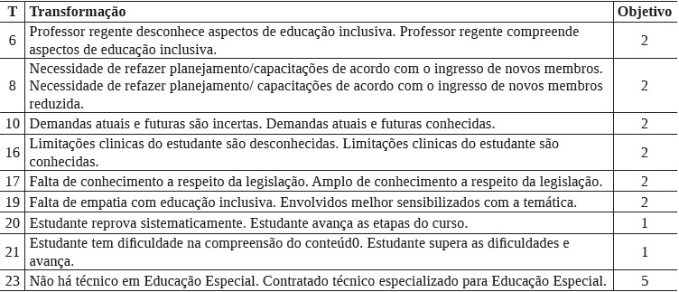 Após o relacionamento entre as transformações e objetivos, a última etapa foi de levantar o conjunto de atividades que permitiam operacionalizar as transformações. Neste estudo duas transformações foram selecionadas e planejadas, uma relacionada com a dificuldade de compreensão do estudante com NEE e outra com o fracasso escolar. Superadas tais questões, atendem diretamente ao objetivo de aumentar a quantidade de estudantes formados e consequentemente contribui para reduzir a evasão escolar.