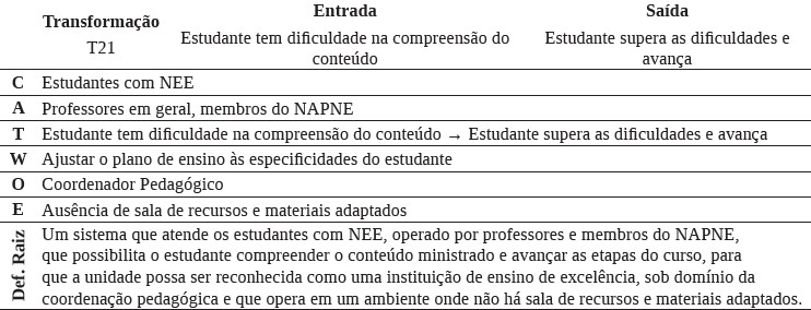 As transformações selecionadas foram contextualizadas com CATWOE e resumidas com a Definição Raiz. As Tabelas 4 e 5 apresentam essas informações para as transformações T20 e T21, respectivamente.