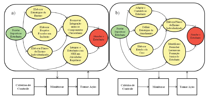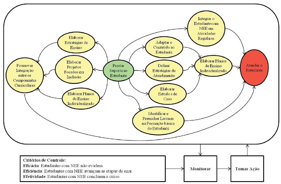 O Supersistema, apresentado na Figura 5, contém o conjunto de atividades necessárias para atendi- mento ao estudante com NEE de modo que o mesmo seja capaz não apenas de ingressar na instituição de ensino, mas também de avançar as etapas, concluir o curso e estar apto a ingressar no mercado de trabalho na profissão escolhida. As atividades identificadas para realizar as transformações podem contribuir para mitigar dificuldades, superar barreiras e promover um verdadeiro processo de inclusão na instituição.