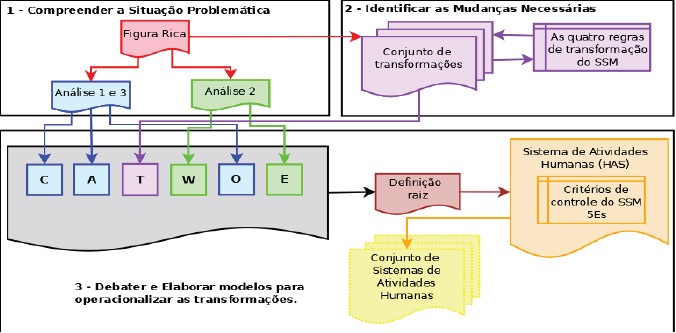 A aplicação do SSM parte da elaboração da Figura Rica, um desenho livre que representa a situação problemática e das Análises Um, Dois e Três, que identificam e descrevem os atores envolvidos. Estas técnicas geram informações para compreender de forma mais aprofundada a situação em estudo. A partir deste ponto, identificam-se estados indesejados que devem ser “transformados” em estados desejáveis. Cada transformação é contextualizada utilizando o mnemônico CATWOE, uma expressão para Clientes (Clients), Atores (Actors), Transformação (Transformation), Visão de mundo (Weltanschauung ou World view), Proprietários (Owners) e Restrições de ambiente (Enviromental Constraints). Os ele- mentos do CATWOE são integrados em uma expressão denominada “Definição Raiz”, uma frase única que permite responder o que está sendo realizado na transformação, por quem, para quem e sob quais condições (GEORGIOU, 2015).