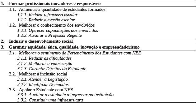Na hierarquia de objetivos é possível destacar três objetivos fundamentais: a) formar profissionais inovadores e responsáveis; b) induzir o desenvolvimento social e; c) garantir equidade, ética, qualidade, inovação e empreendedorismo. Com os objetivos hierarquizados é possível seguir para a construção da rede de objetivos meio-fim. O resultado é apresentado na Figura 4.