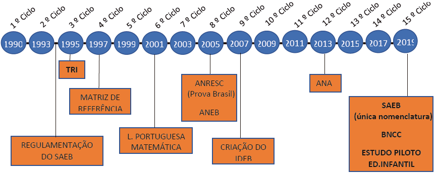 O sistema de avaliação de abrangência nacional teve o seu primeiro ciclo em 1990, passando constantemente por variações nos formatos e arranjos metodológicos até o momento atual, conforme demonstração da figura 1: