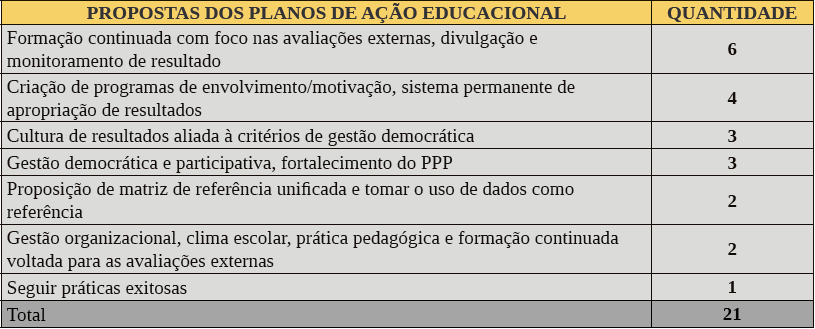 Os planos de ação relacionados no Quadro 1 representam o esforço da produção técnico-científica em contribuir com questões relativas à política de avaliação em larga. A maioria propõe o uso eficaz e eficiente dos resultados, por meio da formação continuada, principalmente com foco nas avaliações externas, com uma divulgação mais ampla dos resultados, seguida de monitoramento contínuo.