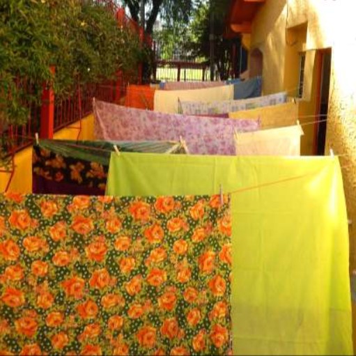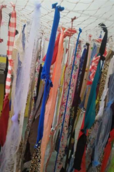 Por sua vez, apresentamos outra instalação de jogo (RUIZ DE VELASCO GÁLVEZ; ABAD MOLINA, 2019) que foi realizada também no âmbito da pesquisa citada anteriormente, para esta proposta15 foram amarradas tiras de tecido em uma base de rede16quadrada. Consideramos relevante pontuar que os diversos tecidos que compõem a proposta, foram reutilizados pois seriam descartes de costura.