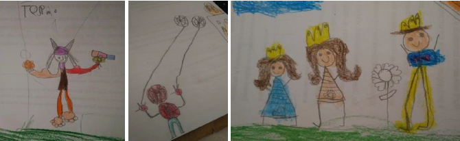 Em termos de elementos visuais característicos das princesas (vestido longo, cabelos compridos, coroas), a condução da experimentação evidenciou a produção de narrativas visuais pouco diferenciadas daquelas encontradas nas capas dos cadernos e nas mochilas que as crianças apresentaram. Raras foram as representações em que a figura se distanciava desses aspectos quanto a caracterização, adereços, cenários e situações apresentadas. Percebemos que o desafio para os meninos foi maior do que para as meninas, uma vez que não lhes era familiar desenhar princesas. Diante dessa percepção, propusemos que as duplas fossem formadas por uma menina e um menino, no intuito de possibilitar a discussão.