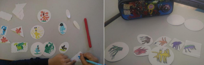 Esta proposição gerou como materialidade figurinhas que apresentavam personagens criados pelas crianças. Como materiais gráficos, optamos por canetas hidrográficas, que permitiam a fixação dos desenhos em pedaços de papel adesivo, em diferentes tamanhos e formatos. Desse modo, as crianças teriam que adaptar suas produções de acordo com os suportes diferenciados que foram ofertados (em formatos geométricos variados e/ou orgânicos), em dimensões que não ultrapassavam dez centímetros quadrados. Dentre as produções, percebemos o uso frequente de asas nos personagens, roupas coloridas e acessórios, como cintos multiuso, capas e luvas que disparavam luzes e outros efeitos. A Figura 2 faz referência à experiência.