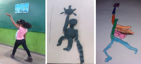 Quando apresentadas à imagem de O Idealista, várias crianças reproduziram o movimento que a escultura permitia, numa gestualidade própria e espontânea, através do balanço dos corpos, do equilíbrio e da posição, imaginando-se a escultura. Posteriormente, iniciaram suas representações gráficas através do desenho, fazendo uso de materiais convencionais, como papel sulfite, lápis de cor, canetinhas hidrográficas e giz de cera. Exploraram seus imaginários através de combinações de formas coloridas simulando movimentos semelhantes ao da escultura. Além do material de desenho, foi disponibilizada massa de modelar colorida, material em que as crianças seguiram fazendo referência à escultura, explorando a densidade e solucionando problemas, como a verticalidade e a sustentação da figura. A Figura 3 apresenta alguns resultados: