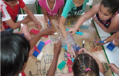 Conforme Taschetto (2014, p. 37), a Arte Pública “é constituída por um conjunto de significações que interagem entre si, em um processo de pertencimento do e no espaço/tempo ao interagirem com o público e o conjunto da cidade”. Tomados por esta concepção, buscamos instigar as crianças a identificar a localização do painel por meio de indagações, incentivando-as a imaginarem situações para a imagem, narrativas que pudessem dar contada cena que estava sendo representada. Ao se sentirem autorizadas a inventar estórias para a imagem projetada, percebemos que a dinâmica de devolver às crianças o poder de interpretação segue sendo um potente recurso para fomentar seu protagonismo. Acreditamos que, implicitamente, estamos dizendo que não há regras para interpretar uma obra ou uma imagem, mas o jeito peculiar de cada um(a).Para estas práticas, novamente foram disponibilizados materiais convencionais: canetões coloridos, papéis para colagem, giz de cera e lápis de cor. De posse desses materiais, as crianças produziram quatro painéis colaborativos, híbridos em suas narrativas visuais e representações. A Figura 4 apresenta alguns resultados desta proposição: