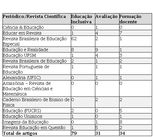 De um total de 1.507 artigos publicados em 14 periódicos no período delimitado entre 2018 e 2019 foram selecionados 144 estudos que apresentaram em seus títulos e/ou palavras-chaves os descritores Educação Inclusiva, Avaliação e Formação Docente. Em seguida, realizou-se a leitura dos resumos dos artigos selecionados, os quais foram separados em três grupos a partir dos descritores, com o intuito de organizar os dados e facilitar o processo de classificação daqueles que mais se aproximavam do estudo/tema de interesse proposto pela pesquisa. O objetivo dessa busca foi filtrar os estudos cujo foco estivesse em Formação Docente, Avaliação e Processo Inclusivo dos alunos que atualmente necessitam de atendimento nas instituições de ensino da rede regular de ensino.