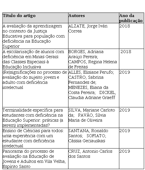 A partir da análise dos artigos encontrados nos periódicos, foram selecionados seis estudos que, diante de uma leitura minuciosa, evidenciaram a aproximação com o tema proposto e, ainda, contribuíram com as suas discussões e diálogos. É evidente que os textos selecionados durante a elaboração do Estado do Conhecimento possibilitaram, também, dar prosseguimento mais seguro às leituras, ou seja, permitiram alinhavar toda a estrutura teórica necessária para desenvolver e aprofundar os conhecimentos sobre Processos Inclusivos, Avaliação e Formação de Professores.