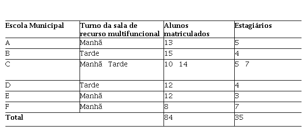 Na Tabela 1, a seguir, apresenta-se a relação de escolas regulares das séries iniciais do Ensino Fundamental que possuem sala de recurso multifuncional, bem como seus turnos de atendimento, o total de alunos matriculados no Atendimento Educacional Especializado da rede municipal de Campina Grande do Sul (PR) e a alocação dos acadêmicos para realização do estágio supervisionado. Cumpre informar que os nomes das escolas foram suprimidos, a fim de resguardar a identidade dos participantes do estudo.