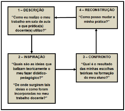 Na figura 1, retomamos os questionamentos que estabelecemos, anteriormente, no 8º princípio, num diálogo com o pensamento de García (1995), para explicar o ponto de partida da formação do pensamento crítico do professor sobre a sua prática docente. Para isso, recorremos a Smyth (1991), que propõe quatro indagações para a reflexão do professor, são elas: Descrição: O que eu faço?; Inspiração: Qual é o sentido do ensino que eu transmito?; Confrontação: Como me tornei assim?; Reconstrução: Como poderia fazer as coisas de forma diferente?
