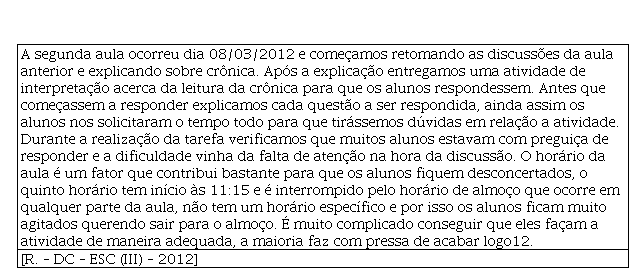 Ao longo dessas rememorações, o AM refaz as suas ações no sentido de recuperar informações que possam fazê-lo examinar todo o cenário da aula. Um dado que chama a nossa atenção é o registro acerca da falta de entusiasmo dos discentes em realizar a tarefa proposta pelo professor em formação inicial, que atribui o motivo à “preguiça” e à “falta de atenção” dos alunos. O horário da aula e o fato de que a aula pode ser interrompida em qualquer momento em razão do almoço dos discentes, visto que “não tem um horário específico”, causa uma situação incômoda para o professor que fica impossibilitado de chamar a atenção dos estudantes e incapacitado para “competir” com a hora do almoço. Tal como pode ser observado, esse DC não é um texto puramente narrativo, pois nele existem trechos nos quais o AM se desprende da narração, identificado no momento em que o acadêmico discute o motivo da agitação dos alunos da EB.