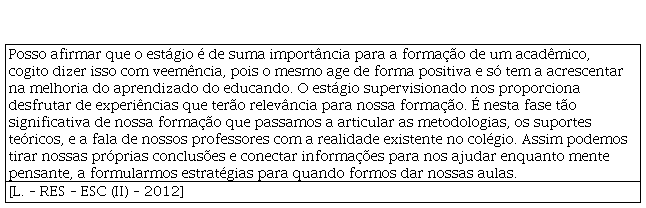 O trecho do RES mostra a INSPIRAÇÃO como fase do processo de reflexão do professor em formação inicial. O AM inicia o texto mencionando a relevância do ESC e a importância para a formação do futuro professor. Ao afirmar que “É nesta fase tão significativa de nossa formação que passamos a articular as metodologias, os suportes teóricos, e a fala de nossos professores com a realidade existente no colégio”, o aluno-mestre relaciona as aprendizagens proporcionadas pelo curso formador como desencadeadoras da profissionalização.