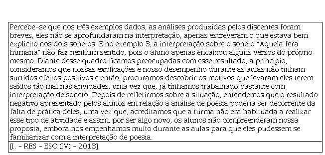 A sua conclusão sobre o fato é de que “os alunos não compreenderam nossa proposta, embora nos empenhamos muito durante as aulas para que eles pudessem se familiarizar com a interpretação de poesia”. Após ponderar o seu próprio empenho no planejamento e na realização das aulas, o aluno-mestre considera que a falta de familiaridade dos alunos da EB com o texto literário dificultou a sua apropriação com o gênero trabalhado na aula.