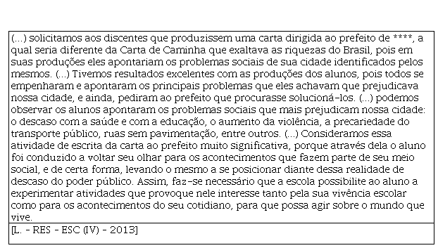 Sobre essa atividade, o acadêmico afirma que os resultados foram “excelentes (...), pois todos se empenharam e apontaram os principais problemas que eles achavam que prejudicava nossa cidade, e ainda, pediram ao prefeito que procurasse solucioná-los”. Nesse contexto, além de o aluno da EB escrever sobre um dado da realidade dele, ele também tinha um leitor potencial para quem a carta estava endereçada, o prefeito.