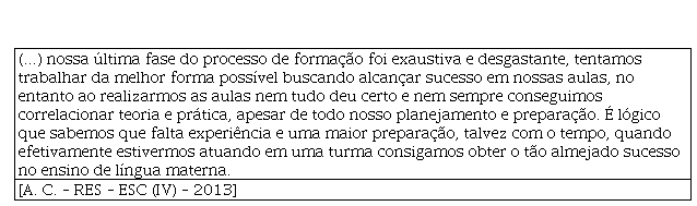 Mesmo considerando esse fato, o ESC marca o início de uma trajetória na docência do futuro professor. No recorte, “quando efetivamente estivermos atuando em uma turma consigamos obter o tão almejado sucesso no ensino de língua materna” existe um desejo contido de atuar na educação, de pôr à prova os conhecimentos adquiridos, de experienciar de forma efetiva o dia a dia de uma escola, de uma sala de aula.