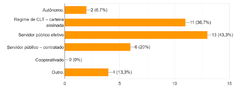 Conforme gráfico a seguir, a maior parte daqueles que estão trabalhando encontram-se no serviço público, na condição de efetivos ou contratados.