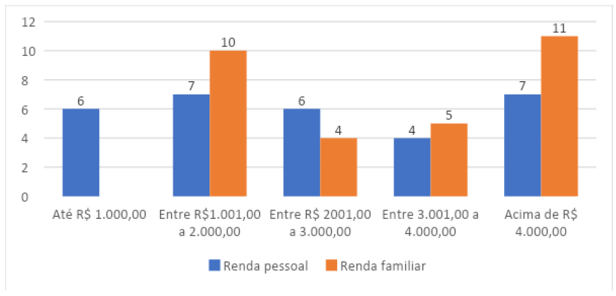 Todavia, a renda de até R$ 2000,00, aproximadamente dois salários mínimos, é a realidade de 43,3% de egressos com essa renda pessoal e de 33,3% com essa renda total na família. Esse percentual também é significativo, pois revela uma renda baixa para pessoas que possuem escolaridade de nível superior.