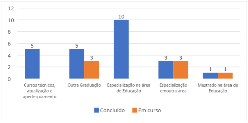 É significativo o número de licenciados que deram continuidade à formação através de cursos de pós-graduação, o que demonstra interesse dos egressos em buscar aperfeiçoamento para o exercício e progressão na carreira docente. De outra forma, a alta procura pelos cursos de especializações evidencia certa “facilidade” oferecida por meio da educação a distância, modalidade que vem crescendo no Brasil nos últimos anos.