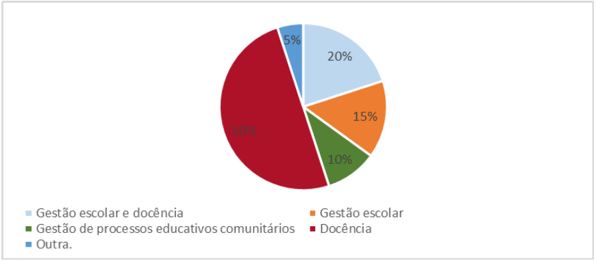 Pelo gráfico nota-se que metade de nossa amostra atua exclusivamente na docência e 20% tanto na docência como na gestão, constituindo um total de 70% de egressos que atuam como professores. O percentual (total) de 35% atuando na gestão de processos educativos é significativo e de importante análise, se considerarmos as transformações almejadas para as escolas no âmbito do Movimento da Educação do Campo. O que se espera é uma transformação da forma escolar vigente na sociedade capitalista, que é pautada no individualismo, competitividade e na fragmentação do conhecimento, para uma escola que apresente como horizonte outro projeto de sociedade e de ensino, que tenha como parte de seu projeto educativo e social: as práticas de trabalhos coletivos e solidários; a democratização da educação, da gestão e do saber; a integração entre teoria e prática, como práxis. O professor, sozinho enfrenta maiores dificuldades para conduzir essa tarefa, por isso, é fundamental que esses propósitos estejam presentes também com os responsáveis pela gestão educacional.