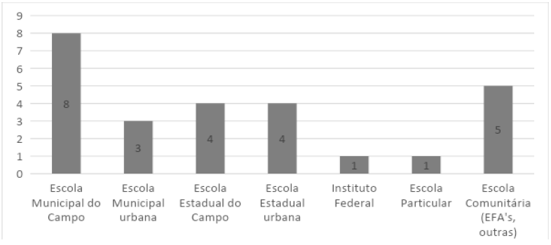 Tendo em vista a existência de egressos atuando em mais de uma instituição de ensino, o questionário possibilitou ao licenciado marcar mais de um item nessa questão. Esses dados evidenciam o vínculo de egressos em instituições de ensino do campo (17) em pelo menos um turno de trabalho. De forma positiva, o gráfico expressa boa inserção dos egressos nessas instituições, atendendo às expectativas das LECs de contribuir para a formação de professores de escolas do campo. Embora muitos tenham dupla jornada, os dados indicam que a grande maioria tem atuação em escolas do campo.