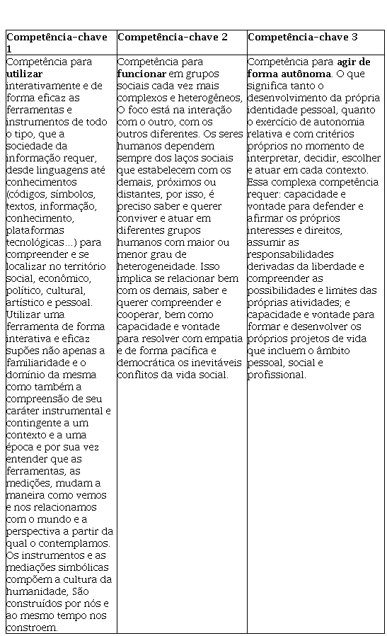 Para melhor compreensão das interpretações apresentadas neste texto, faz-se necessário relatar quais são as prioridades educacionais da OCDE (2006), que são apresentadas no documento: Definição e Seleção de Competências: Fundações Teóricas e Conceptuais - DeSeCo. Elas são apresentadas no quadro a seguir, que enfoca as três competências fundamentais ou chaves.