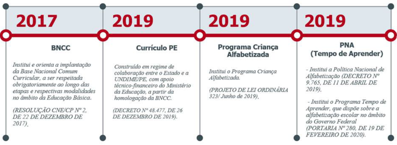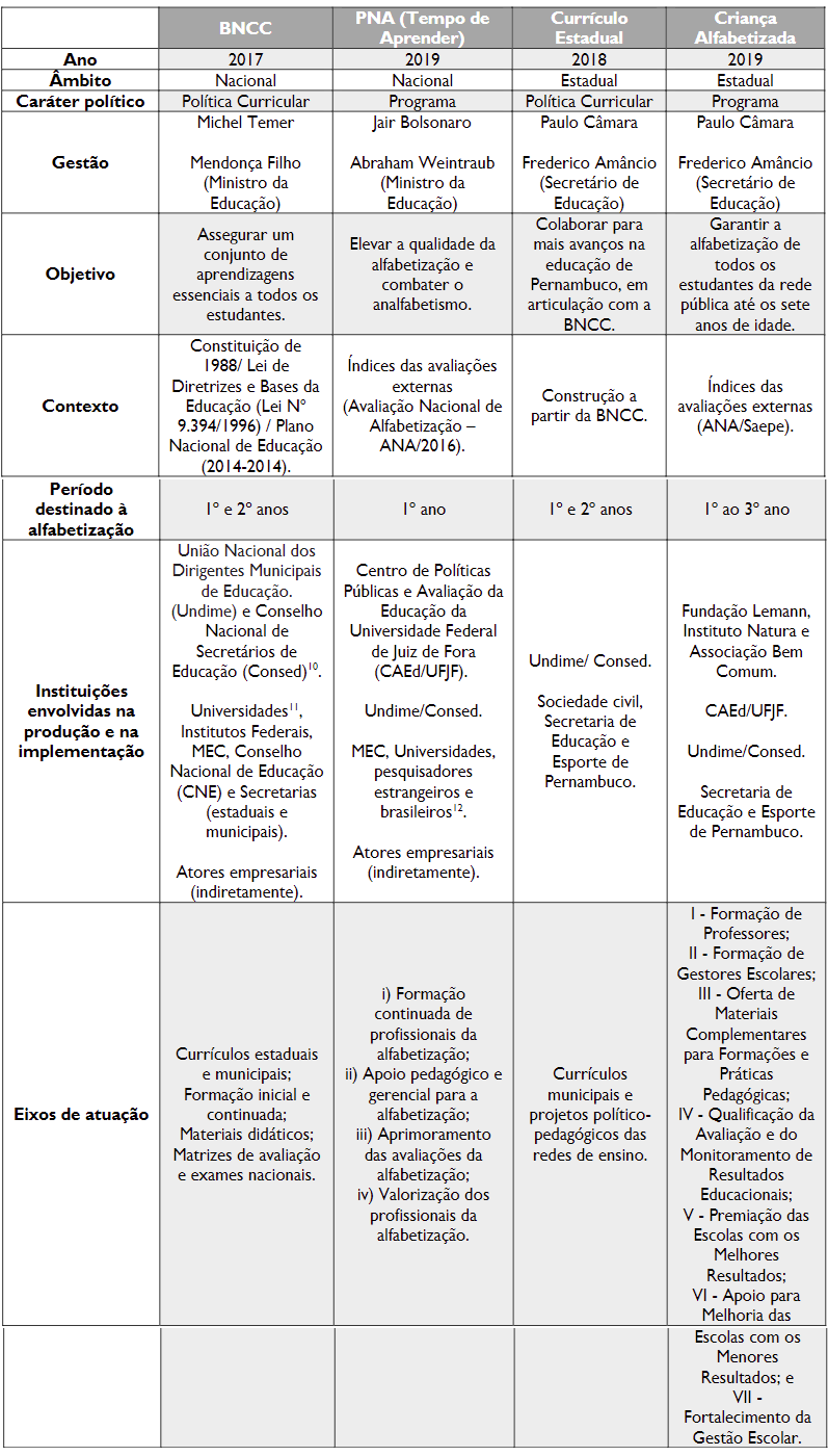 Além disso, no rol das políticas educacionais estaduais, Pernambuco implementou, em 2019, o Programa Criança Alfabetizada, em busca de promover melhorias no processo de alfabetização. Nesse momento, teve-se um quadro educacional no estado pernambucano com a presença de uma política curricular (o Currículo de Pernambuco) voltada à educação e à alfabetização de crianças, ao mesmo tempo em que há uma proposição política específica para o processo de alfabetização (o Criança Alfabetizada). Ressaltamos que, no plano governamental estadual, ao contrário do cenário nacional, em que se observou um período de amplos retrocessos para a educação, não há grandes alterações na orientação e no modelo educacional proposto pelo estado pernambucano. Contudo, o contexto nacional influencia fortemente o campo local, na medida em que define, regulamenta e implementa diretrizes para a educação brasileira, no formato de leis, de decretos, de planos e de projetos.