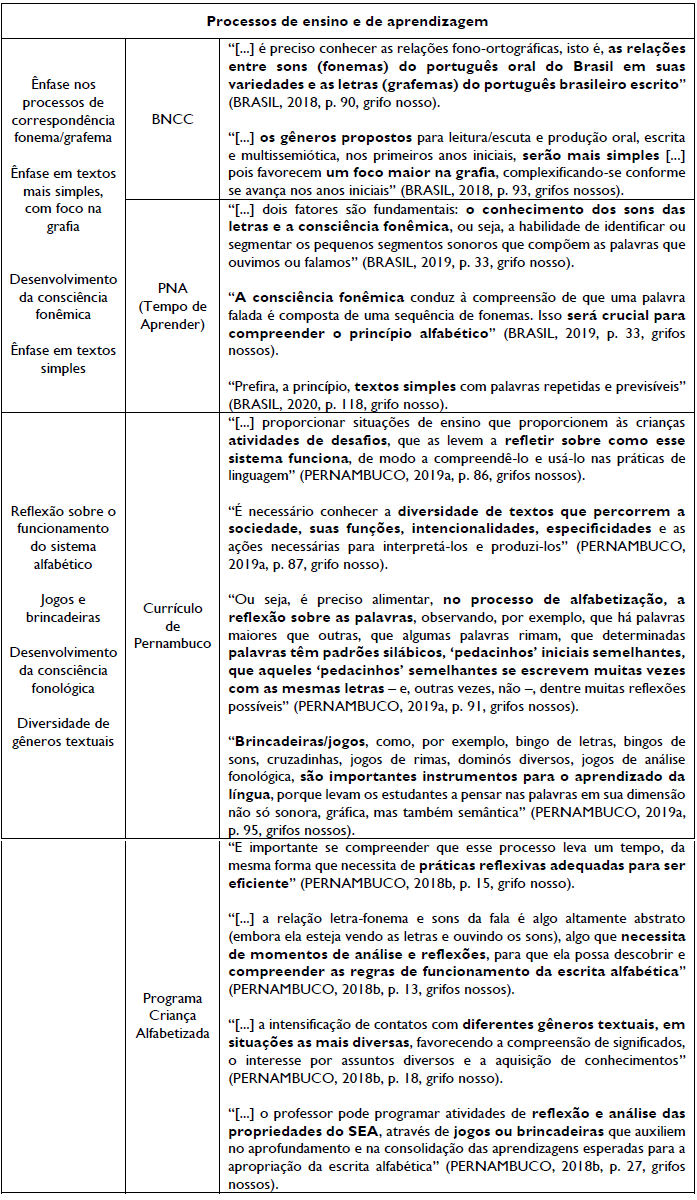 A apresentação das diretrizes e dos princípios norteadores das quatro proposições políticas destacadas no Quadro 1 permite-nos uma visão ampla de como as proposições oficiais têm buscado orientar o processo de alfabetização de crianças, nas redes de ensino públicas no contexto pernambucano. Ante a esse conjunto de dados, alguns aspectos merecem destaque. Um primeiro deles refere-se ao de implementação. Três das políticas propostas (Currículo de Pernambuco, PNA e Programa Criança Alfabetizada) foram promulgadas em 2019, mantendo um aspecto comum entre elas: a relação com a BNCC. Todas elas destacam tomar como referência a BNCC na construção de suas propostas: “Traz como pilares os conhecimentos definidos pela Base Nacional Comum Curricular para a Educação Infantil e Ensino Fundamental” (PERNAMBUCO, 2019a, p. 13); “São princípios do Programa Tempo de Aprender, em consonância com a Base Nacional Comum Curricular – BNCC, aqueles elencados na Política Nacional de Alfabetização – PNA, instituída pelo Decreto nº 9.765, de 11 de abril de 2019” (BRASIL, 2020, p. 2); “É um programa novo e interessante. Além de contemplar a Base Nacional Comum Curricular (BNCC) e o Currículo de Pernambuco [...]” (PERNAMBUCO, 2019c, p. 21).