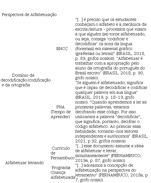 Salientamos que tanto a BNCC (BRASIL, 2018) quanto a PNA (BRASIL, 2019) subtraem a perspectiva do letramento. No documento da Base (BRASIL, 2018), esse conceito é disposto em uma visão de multiletramentos, sob o pretexto de ampliar a visão de letramento, o que parece contribuir para a sua invisibilização, ainda que o mencione em diferentes partes ao longo do texto (BRASIL, 2018, p. 59, 67, 69, 70, por exemplo). Já na PNA, o letramento é integralmente silenciado, sob uma denominação importada, de forma distorcida, de Portugal (“literacia”), ignorando não somente um importante conceito do campo da alfabetização, mas o próprio percurso histórico de constituição dos estudos sobre o(s) letramento(s).