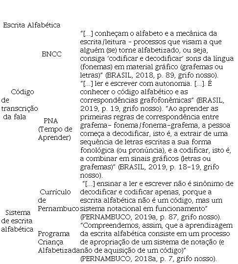 O aprendizado da escrita alfabética ocorre, para a PNA e a BNCC, por meio de processos de “codificação” e de “decodificação”, enquanto, para as proposições estaduais, esse processo se desenvolve por meio da reflexão sobre o funcionamento do sistema alfabético.