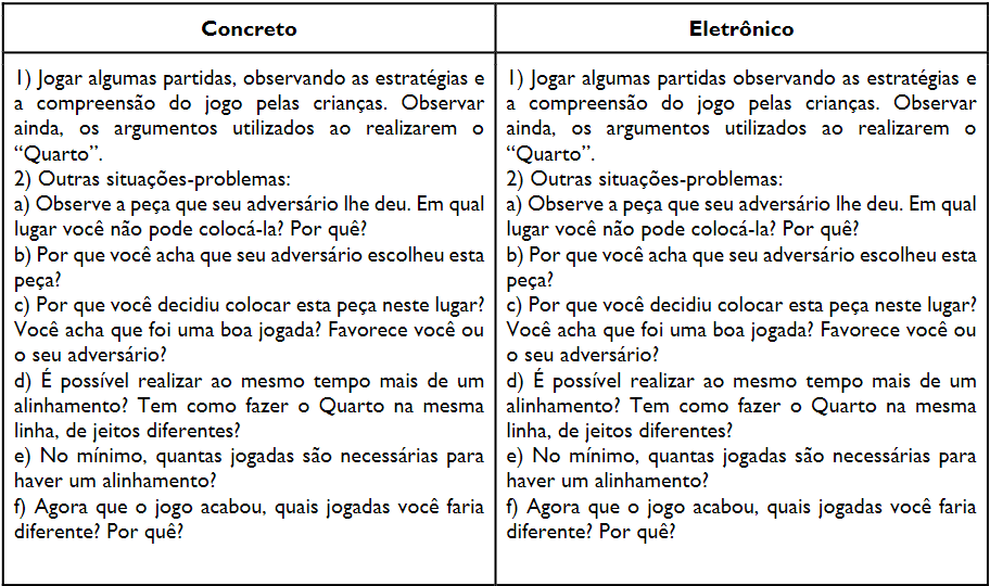 Na versão eletrônica, as crianças apresentaram um jogo mais aleatório ou ao acaso, sem demonstrar compreensão (ou mesmo planejamento) das suas jogadas. Assim, por exemplo, quando se viam diante de uma paralisação do jogo (o que indicava que alguém havia feito alinhamento), demoravam a explicar o processo que resultava em atributos para formar o Quarto. Além disso, jogar eletronicamente caracterizou-se como um jogo mais passivo, pois os participantes ficavam esperando os comandos do tablet para indicar quem seria o próximo a jogar ou quem venceu o jogo.