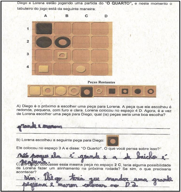 É possível observar que REN considerou corretamente a peça para que Diego não pudesse fazer o alinhamento na jogada seguinte, considerando simultaneamente dois atributos, tamanho e cor. Na terceira questão, de modo semelhantes nos dois grupos experimentais, os participantes conseguiram identificar corretamente apenas uma possibilidade de fazer O Quarto, isto é, alinhamento na horizontal. Assim como ING e REN, nenhum sujeito conseguiu identificar a chance de fazer O Quarto na diagonal.