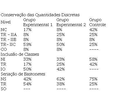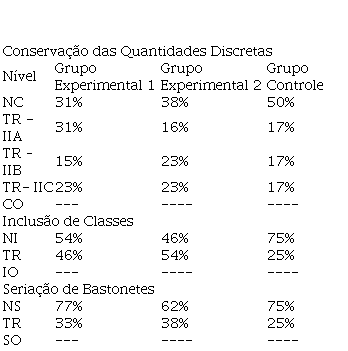 A tabela I, a seguir, apresenta os resultados obtidos no pré-teste, mediante a aplicação das provas de conservação das quantidades descontínuas, inclusão de classes e seriação, nos 3 grupos avaliados.