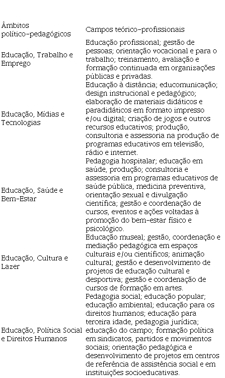 Os âmbitos político-pedagógicos designam de forma mais abrangente os campos de atuação do pedagogo situados fora da esfera da docência e da pedagogia escolar, considerando que neles se desenvolvem ou podem-se desenvolver práticas educativas confluentes com os objetivos político-pedagógicos de organizações públicas e privadas, movimentos sociais e políticas públicas, incluindo aqueles relacionados à própria educação. Os campos teórico-profissionais explicitam de modo mais específico e particular os espaços de atuação do pedagogo na educação não-escolar, sendo também representativos de campos de produção teórica que informam a prática de pedagogos e educadores em alguns desses campos.