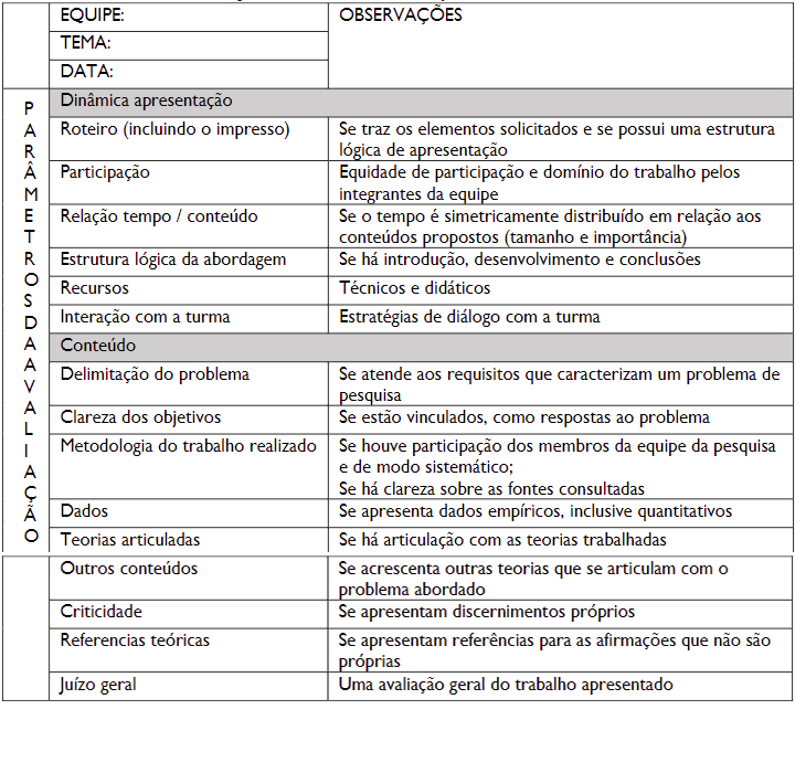 A definição dos problemas a serem analisados delimita o objeto de análise de cada equipe, enquanto é apresentado o barema, isto é, os aspectos que serão avaliados quando da apresentação de suas pesquisas. Qualquer ruído na comunicação ou falta de clareza dessa proposta poderá comprometer o resultado do trabalho. O Quadro 02 apresenta a proposta de barema.