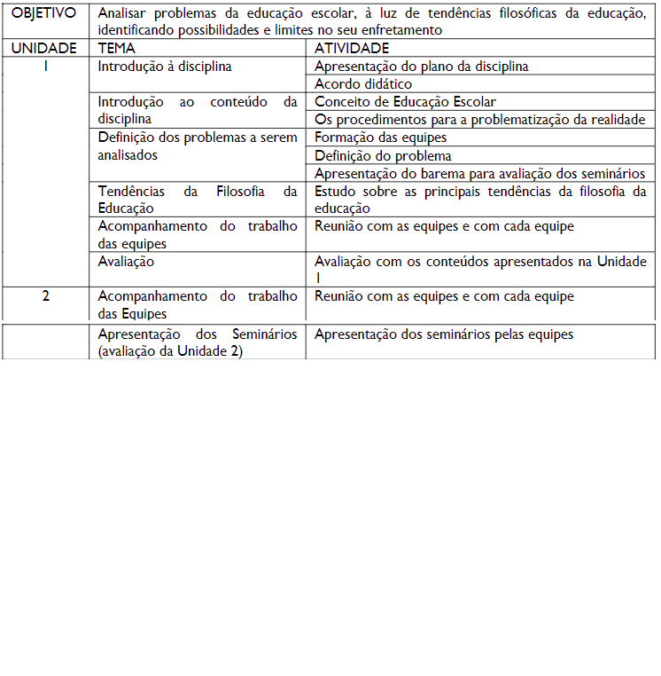 Como primeiro passo da disciplina, é muito importante que o acordo didático seja realizado com clareza, para que os estudantes saibam exatamente o que lhes aguarda, evitando-se problemas como a participação desigual dos educandos no trabalho das equipes. É nesse momento que se apresenta o objetivo ulterior do trabalho da disciplina. As duas primeiras atividades da introdução à disciplina são inputs essenciais. Na primeira, consensualiza-se o conceito sistemático de educação escolar, articulando experiência e teoria, sendo também um momento de avaliação diagnóstica, pois revela o nível de apropriação teórica sobre a educação escolar dos educandos. Na segunda, busca-se superar a compreensão do senso comum sobre problematização da realidade, por meio da construção da reflexão filosófica.