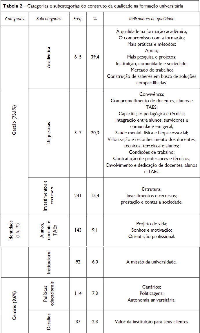 Para responder ao objetivo proposto de analisar a percepção da qualidade na formação universitária da Instituição Federal de Ensino Superior (IFES) do Centro-Oeste brasileiro, os resultados dos 202 instrumentos válidos geraram um total de 386 registros e 1561 referências do que seria a qualidade na formação universitária para os participantes do estudo. A organização dos resultados permitiu a elaboração de três grandes categorias de análise que foram: a) Gestão (concentrando 75,1% das respostas); b) Identidade (15,1%); c) Cenário (9,6%), que se desdobraram em outras subcategorias conforme apresentado na Tabela 2.