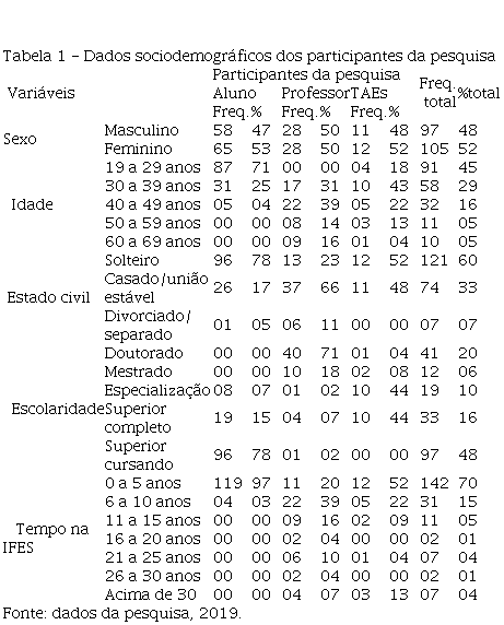 Participaram do estudo 23 servidores Técnicos Administrativos em Educação (TAEs), 56 professores e 123 alunos de diversas áreas do conhecimento (bacharelados em Administração, Ciências Contábeis, Saúde Coletiva, Psicologia; Licenciaturas em Matemática, História, Estatística, Química). Os 202 protagonistas da comunidade acadêmica de uma Instituição Federal de Ensino Superior (IFES) do Centro-Oeste brasileiro foram escolhidos por conveniência, de forma não aleatória. Os dados do perfil sociodemográfico dos participantes (sexo, idade, estado civil, escolaridade, tempo na IFES atual e cargo/função) foram demonstrados na Tabela 1.