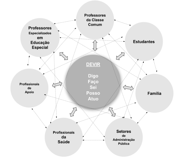 Fonte: Adaptado de Ebersold (2020). Tradução LivrePara Ebersold (2020), a acessibilidade exige um trabalho em cooperação que perpassa pelo trabalho do professor de sala comum articulado com o professor de educação especial, deve envolver outros atores como a família, profissionais de apoio, profissionais da saúde, gestão escolar, setores de administração pública (transportes, secretaria de educação, secretaria da pessoa com deficiência…), visando à cooperação interinstitucional e interindividual. O devir do educando está no centro da ação pública, distante da perspectiva defectológica que essencializa as dificuldades das pessoas. Nessa perspectiva, o ser humano é visto como capaz de evoluir e progredir, desde que os meios necessários (pedagógicos, técnicos, humanos e financeiros) sejam adequadamente mobilizados e ofertados.