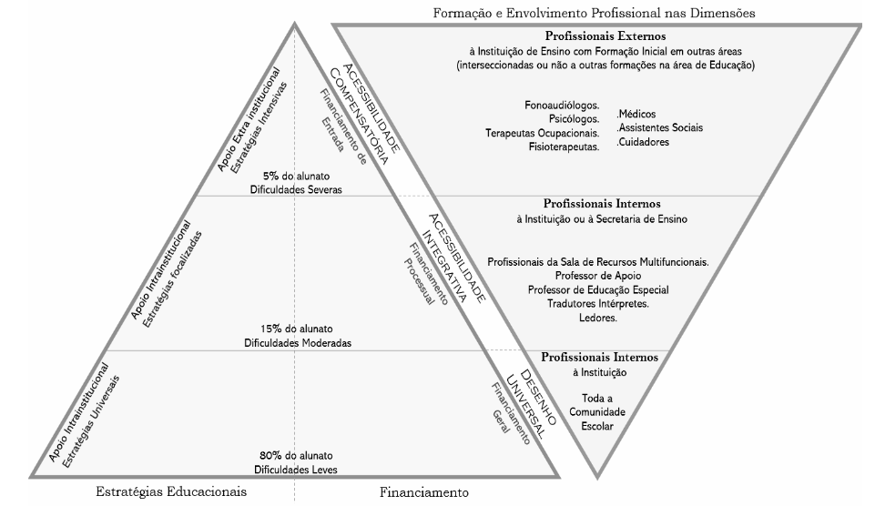 Pela premissa do Ensino multicamadas/multiníveis, a acessibilidade pode ser compensatória, integrada ou universal, conforme Ilustração 3. Ao considerarmos a destinação dos recursos financeiros e sua alocação nos serviços educacionais, em países europeus esses variam de acordo com o nível de acessibilidade e inclusão escolar que é promovido nos sistemas de Educação Inclusiva (EUROPEAN AGENCY, 2016). Neste sentido, a Ilustração 3 demonstra o sistema de apoio multicamada/multinível e como seria o tipo de financiamento de acordo com as estratégias educacionais inclusivas.