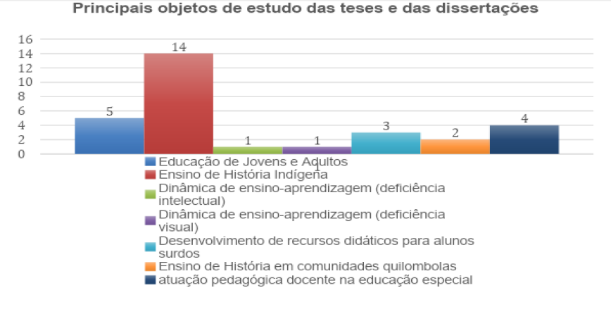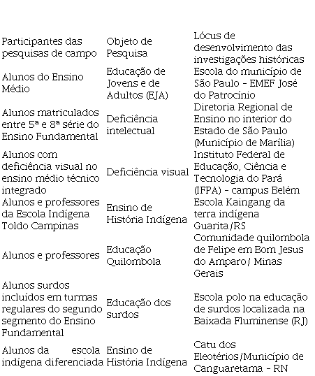 Nesse sentido, buscamos compreender neste trabalho de que maneira as teses e as dissertações da área de História, defendidas em diferentes Programas de Pós-Graduação do Brasil, incorporaram uma mudança de perspectivas no campo da educação verdadeiramente inclusiva. Esta, por conseguinte, não se restringe aos alunos sujeitos à modalidade da Educação Especial e tampouco à adaptação dos procedimentos didáticos para um público circunscrito, pois abrange populações indígenas, comunidades quilombolas, jovens e adultos não alfabetizados, mulheres pobres que se encontram em situação de vulnerabilidade social e demais indivíduos subalternizados. Sob essa ótica, pretendemos apontar as concepções de deficiência e de diferença adotadas em um conjunto de trinta investigações históricas analisadas, as metodologias adotadas, as temáticas recorrentes nas produções e os sujeitos participantes das pesquisas, considerando as diferentes abordagens teórico-metodológicas e as séries do Ensino Fundamental II e do Ensino Médio nas quais as investigações foram realizadas. Privilegiamos essas etapas, porque elas constituem o campo de atuação profissional do historiador.