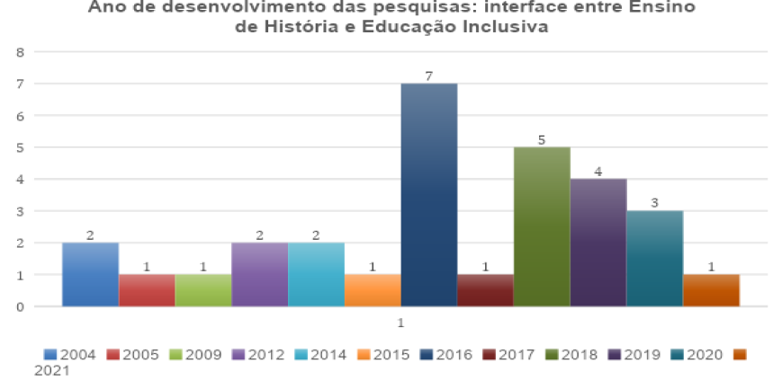 Além disso, nos chama atenção o fato de que as pesquisas sobre ensino e formação docente no atendimento educacional especializado, no campo da História, foram publicadas com maior intensidade a partir do ano de 2016 (Gráfico 2), o qual demarca a decorrência de um ano após a publicação da Lei Brasileira de Inclusão da Pessoa com Deficiência.