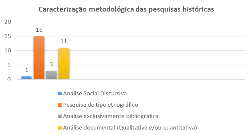 Consoante salientou a historiadora Maria Helena Michels, “a própria formação de professores priorizou as técnicas e os recursos específicos em detrimento da análise do sistema educacional, em seus aspectos econômicos, sociais e políticos” (MICHELS, 2017, p. 36). A partir dos anos 2000, a Resolução CNE/CEB 2/2001 estabeleceu que os professores poderiam obter formação continuada para atuarem na Educação Especial, estabelecendo de maneira imprecisa uma divisão de trabalho menos individualista entre o professor capacitado e o professor especialista em EE, o qual desenvolveria atividades pedagógicas na sala de aula comum. A despeito desse problema que perpassa diferentes níveis, etapas e modalidades de ensino, podemos perceber que a reverberação das necessidades educacionais nas características individuais eximiu a pessoa considerada “deficiente” de suas demandas de aluno. Estas, por conseguinte, foram reconstituídas por diferentes teóricos por meio da utilização esmiuçada de pesquisas de campo que envolveram, com maior ou menor centralidade, metodologias recorrentes no trabalho do historiador em seu ofício investigativo. São exemplos recorrentes à pesquisa de tipo etnográfico, a análise documental, a análise social do discurso e bibliográfica, como explicitado consecutivamente (Gráfico 3).