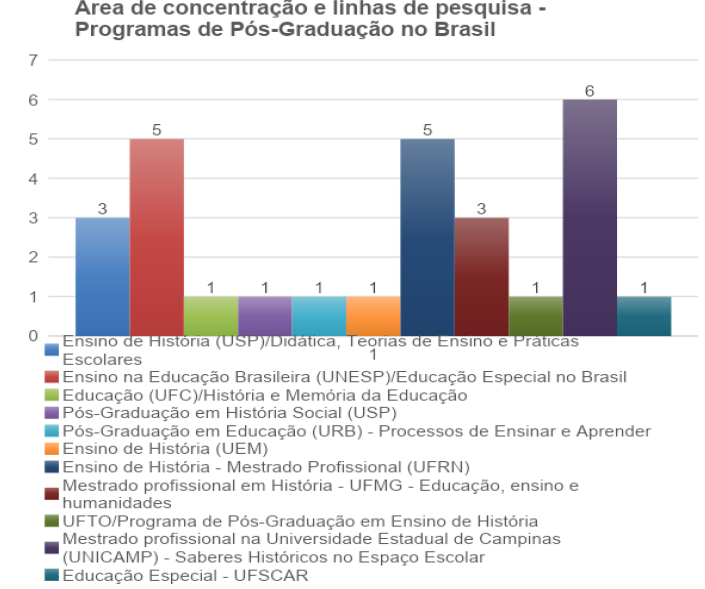 Esse argumento corrobora a investigação de outros acadêmicos que se utilizaram do método de análise documental encadeado à historiografia sobre o ensino de História, majoritariamente nas teses de doutoramento. Um exemplo desses trabalhos intitula-se “Alunos com deficiência na Educação de Jovens e Adultos em assentamentos paulistas: experiências do PRONERA”, defendido no Programa de Pós-Graduação em Educação Especial da Universidade Federal de São Carlos. Esse programa é o único do país específico da área, fundado em 1986 por iniciativa dos profissionais que trabalharam no curso de especialização docente do Centro de Educação e Ciências Humanas. Assim como outras 4 linhas de pesquisa desenvolvidas na região Sudeste do Brasil, esse lócus acadêmico prepondera na produção acadêmica que interliga a pesquisa em História à Educação inclusiva (Gráfico 4).