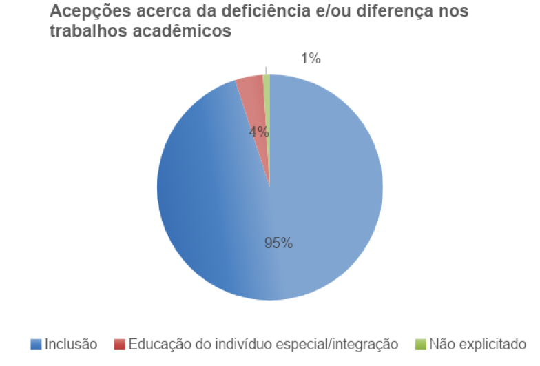 Inserido no eixo da valorização das diferenças, tal projeto “parte do diagnóstico da demanda, penetra fundo nos pontos positivos e nos pontos fracos dos trabalhos desenvolvidos, define prioridades de atuação e objetivos, propõe iniciativas e ações, com metas e responsáveis para coordená-las” (MANTOAN, 2003, p. 35). Dentro dessa proposta, identificamos no conjunto documental em análise avanços acerca da discussão conceitual em torno da historicidade do termo “deficiência” em intersecção ao ensino de História (Gráfico 5). Tendo como objeto de estudo a inclusão da pessoa com deficiência visual na educação profissional, Fernanda Coimbra traça como objetivo compreender essa questão na perspectiva de Educação Profissional Inclusiva por meio de uma pesquisa exploratória, a qual intercruza a história de vida de um aluno ao estudo de caso.