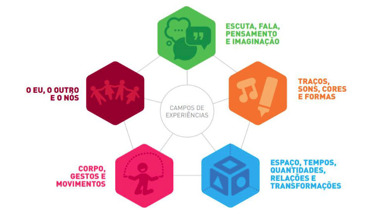 Os campos de experiência podem subsidiar as práticas das crianças isoladamente ou reunindo os objetivos de um ou mais campos e envolvem todos os momentos da jornada (diária e semanal) das crianças na Educação Infantil, incluindo o acolhimento inicial, o momento das refeições, a participação das atividades, as festividades e os encontros com as famílias, as atividades de expressão, investigação e brincadeiras. Assim, os campos não são trabalhados apenas em um dia definido da semana, nem há expectativa de haver uma aula de 45 minutos para o trabalho com um campo em cada dia ou para que determinado bimestre do ano letivo seja dedicado apenas a um campo (BRASIL, 2018a).