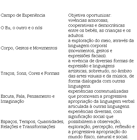 Porém, é possível verificar divergências entre a fundamentação teórico-metodológica, com base na experiência e nos campos de experiências, e os objetivos de aprendizagem e desenvolvimento, pois esses se mostram prescritivos, estabelecem uma expectativa de aprendizagem e enfatizam questões atitudinais, conhecimentos próprios do Ensino Fundamental e de áreas do desenvolvimento infantil. Assim, contradizem e desconsideram as proposições metodológicas que vêm sendo debatidas no campo nos últimos vinte anos, preconizadas pelas diretrizes vigentes (BRASIL, 2009a; BRASIL, 2009b).