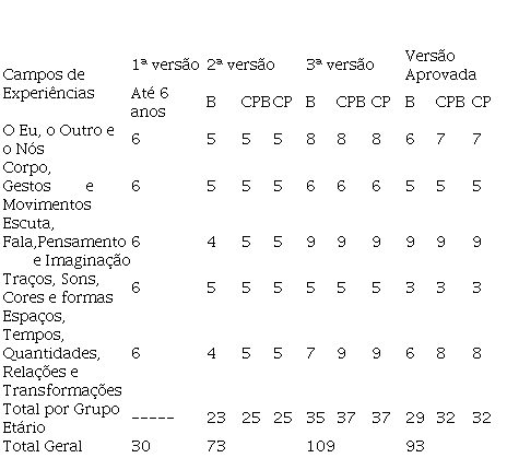 Na 3ª versão (BRASIL, 2017c), ficam evidenciados um maior detalhamento de alguns objetivos e a ampliação da quantidade geral deles, bem como nos grupos etários. Também houve aumento de objetivos nos campos de experiência: O Eu, o Outro e o Nós; Escuta, Fala, Pensamento e Imaginação; e Espaços, Tempos, Quantidades, Relações e Transformações, a fim de enfatizar o comportamento, as questões atitudinais, as dimensões socioemocionais e a escolarização, sobretudo a leitura, a escrita e os números. Isso pode ter sido motivado pela participação acentuada das empresas privadas na elaboração nessa versão do documento